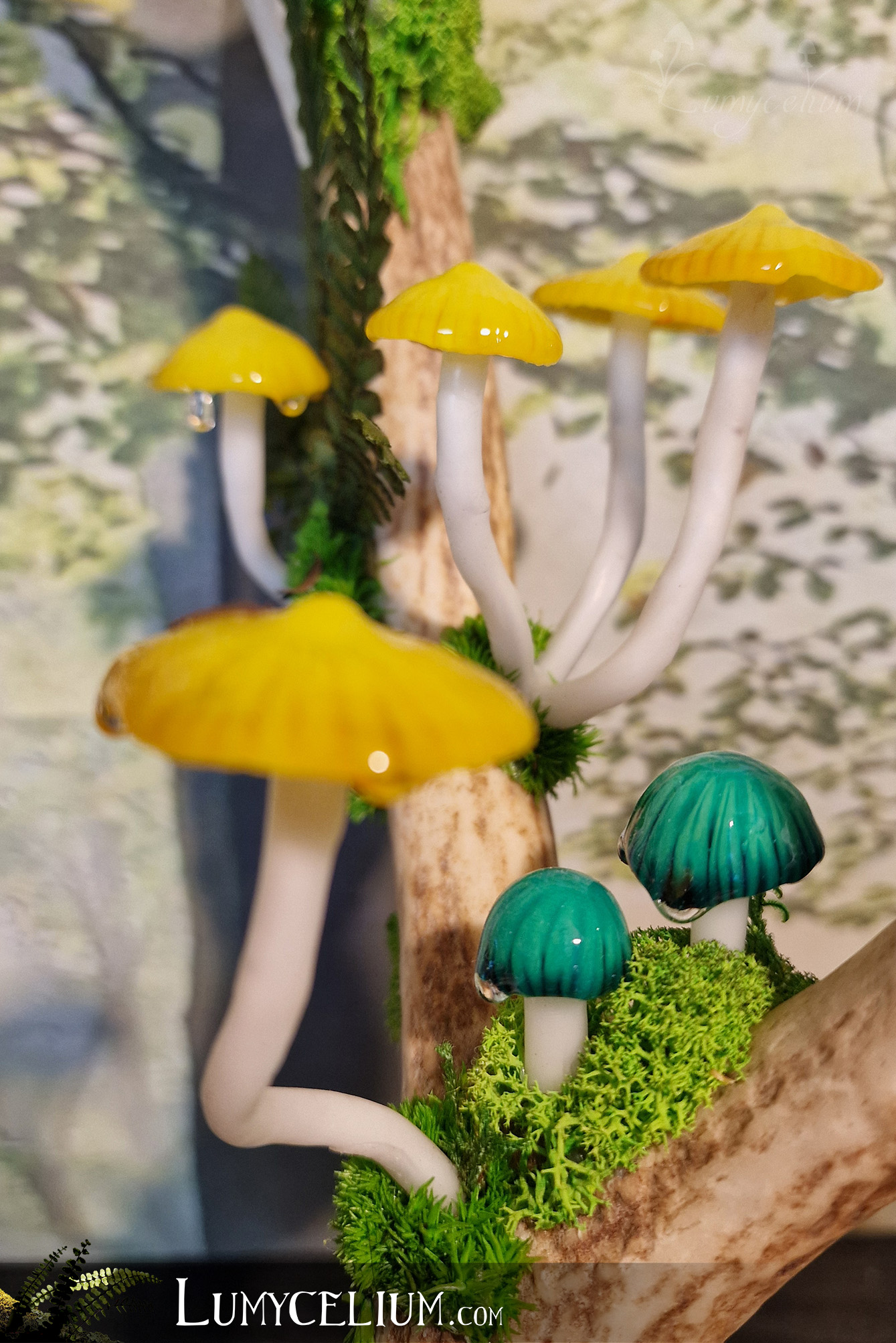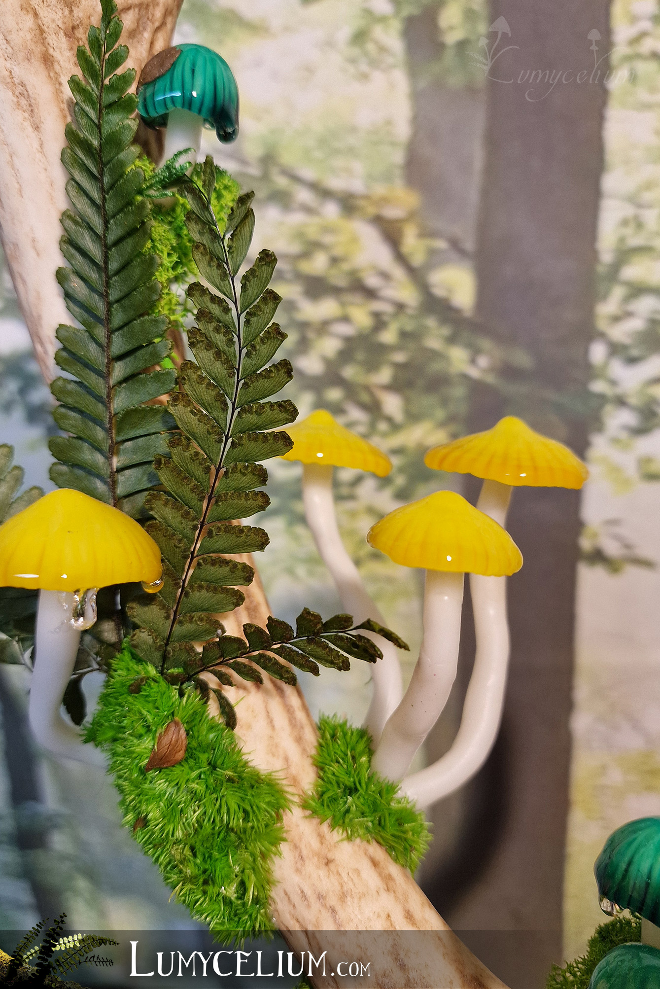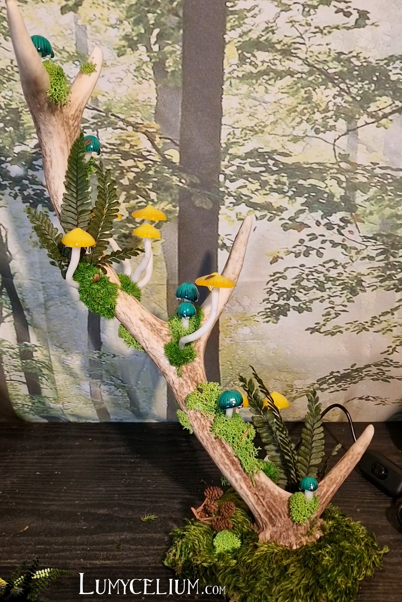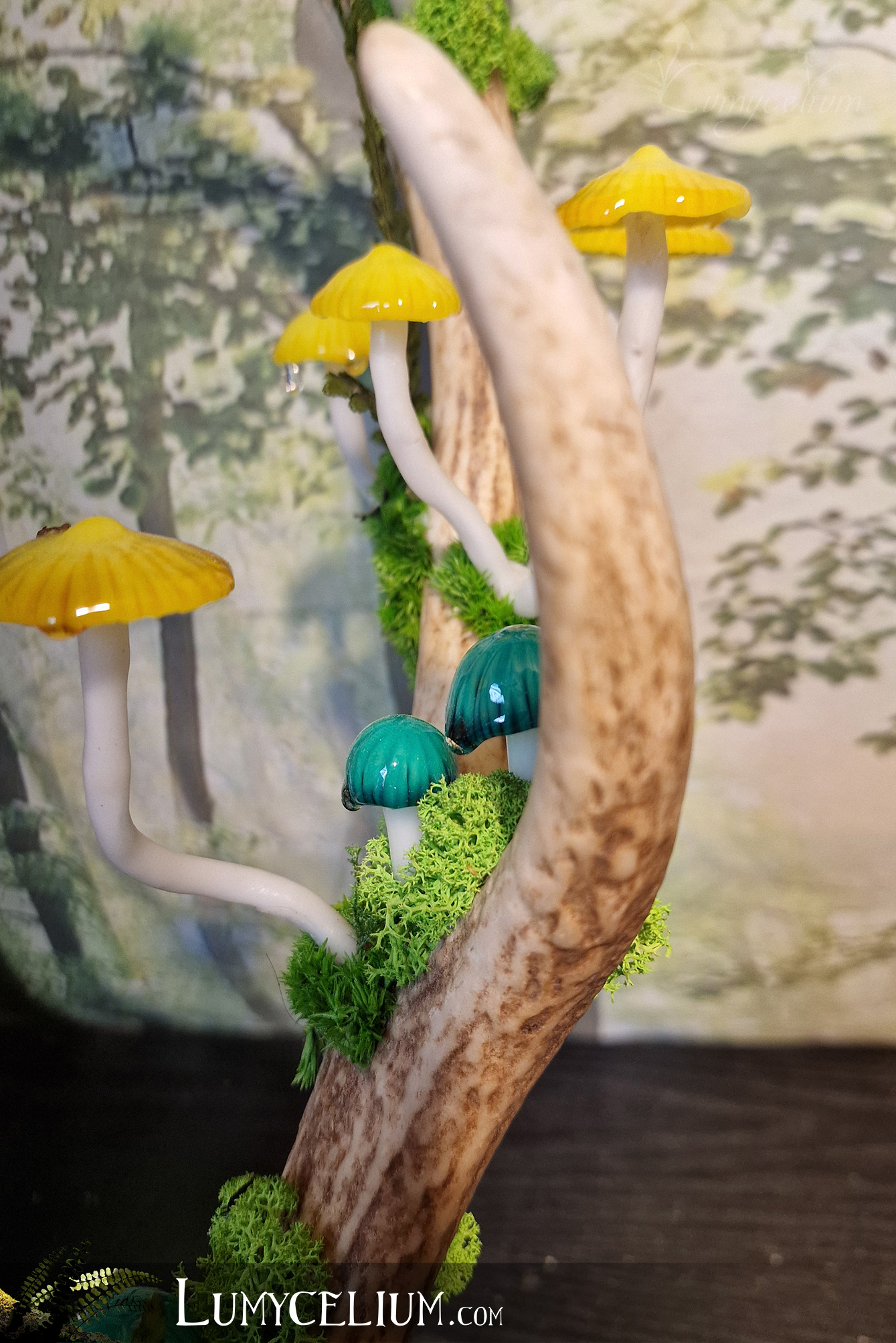 Pièce sur bois de cerf élancée verticale agrémentée de champignons jaune et vert