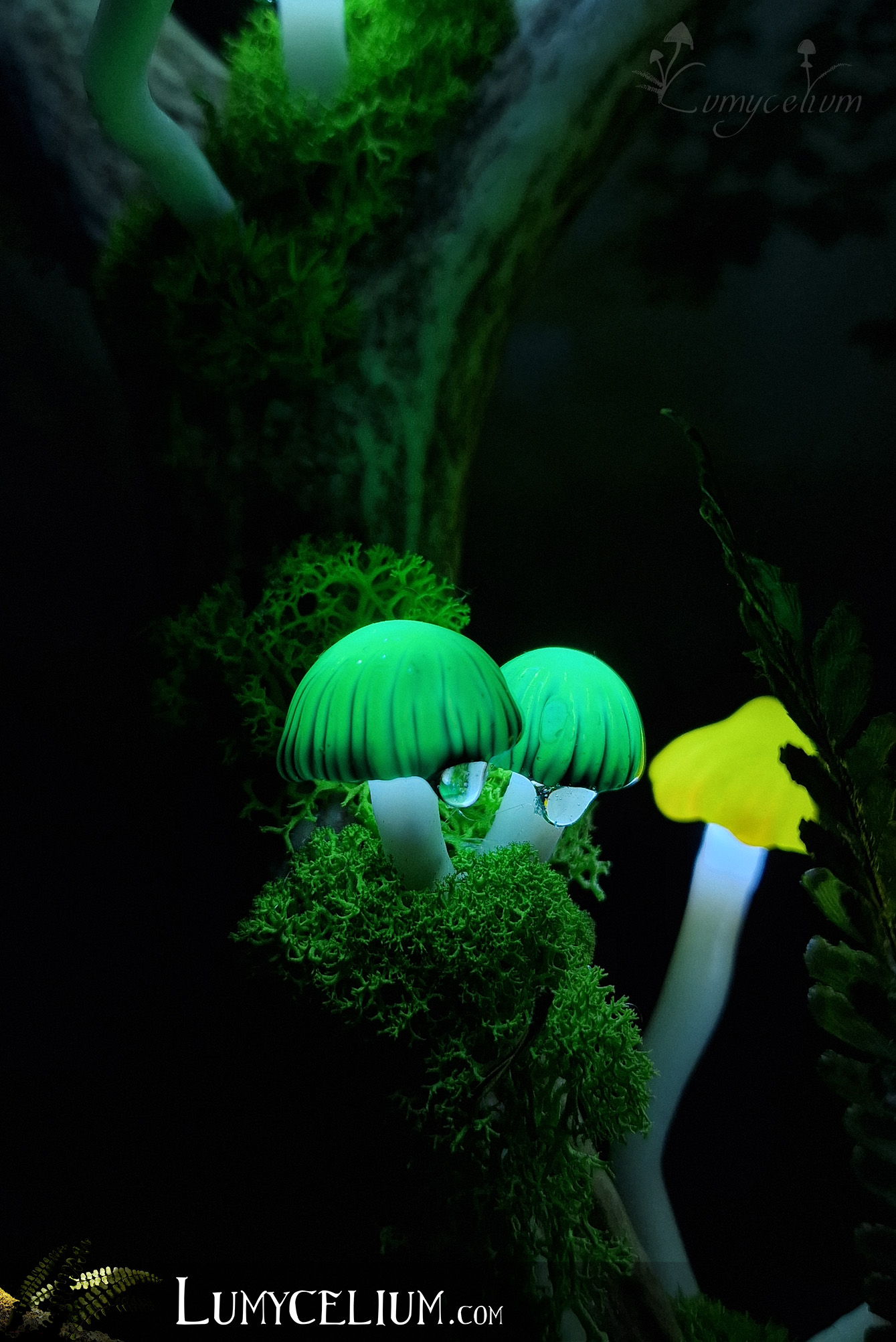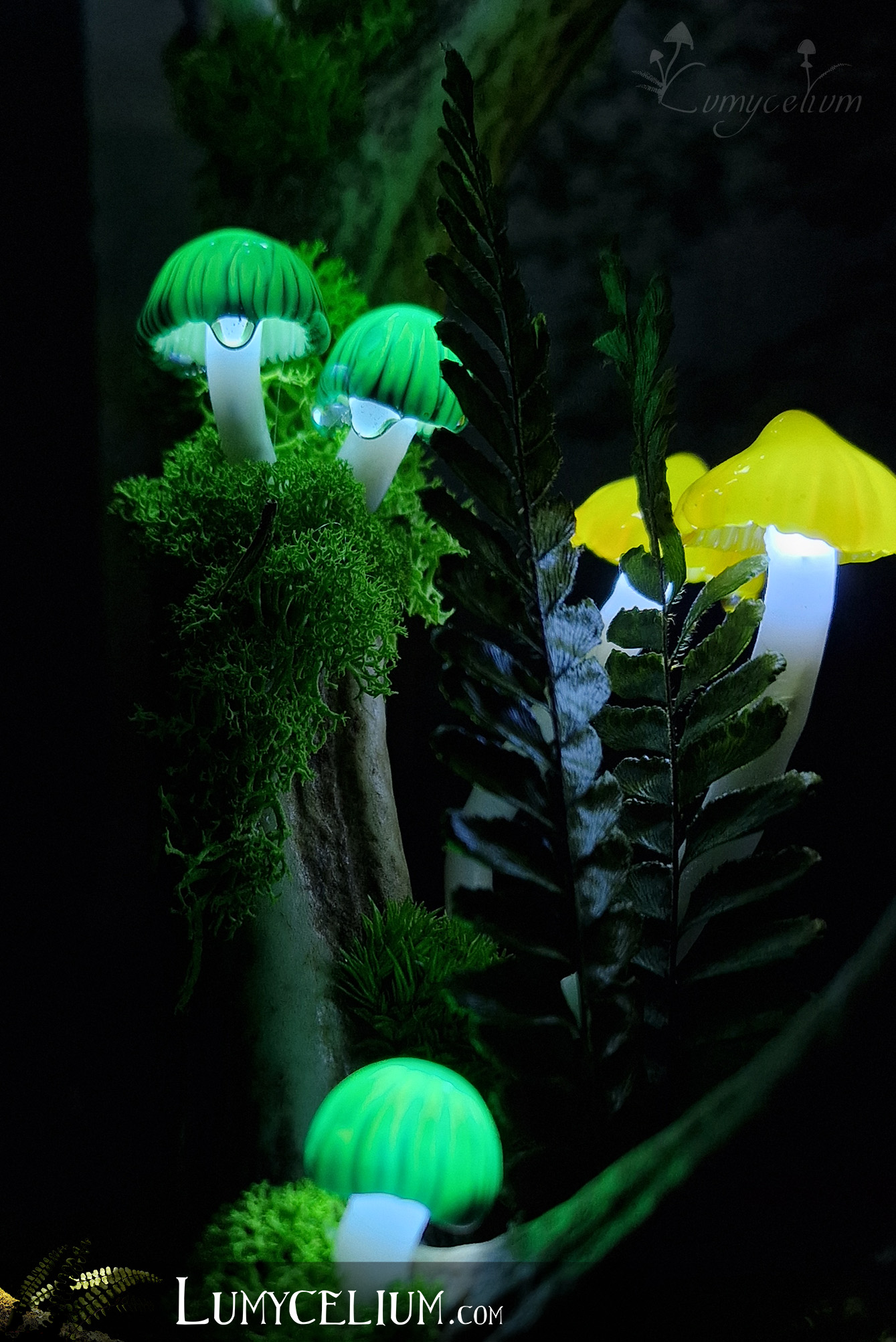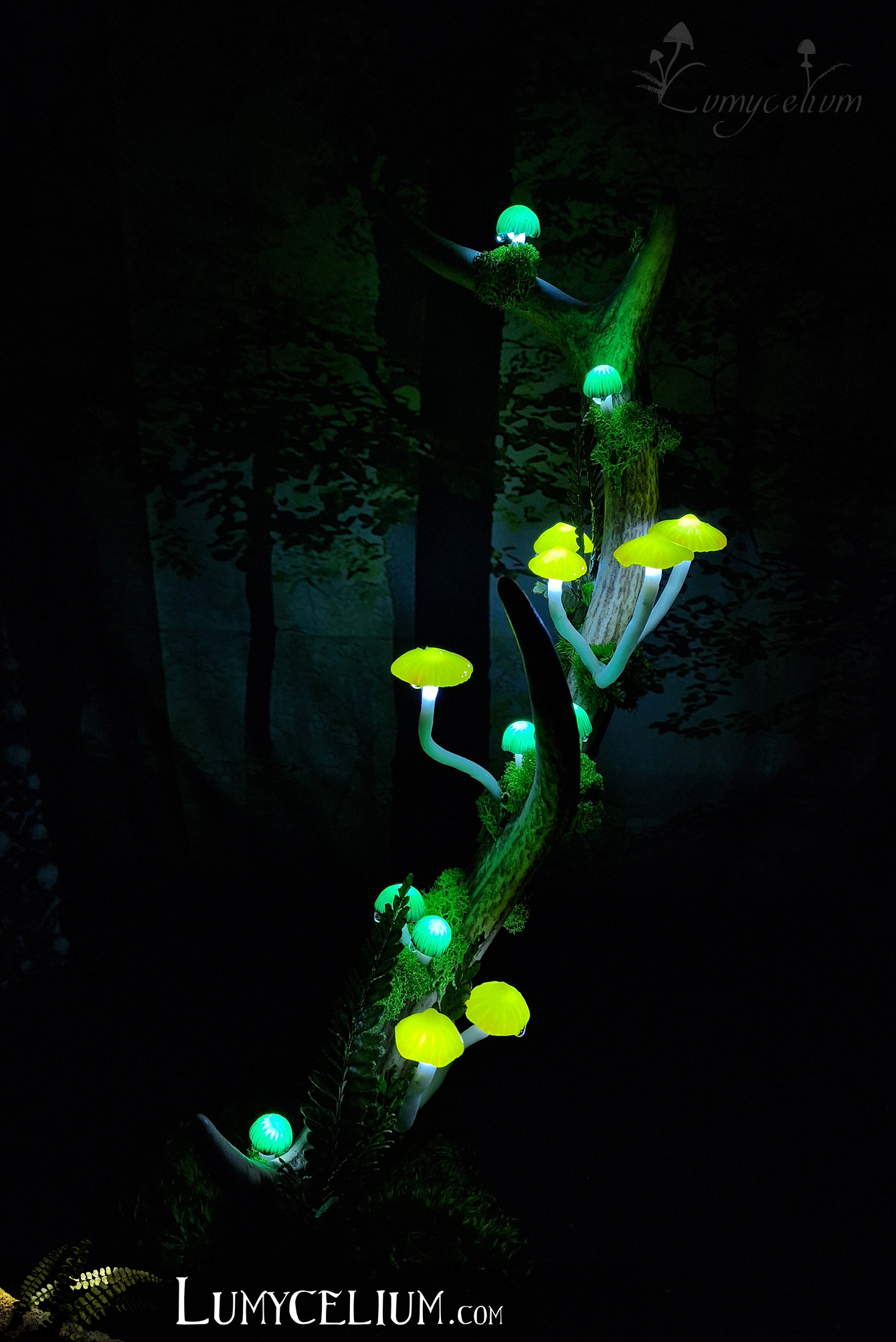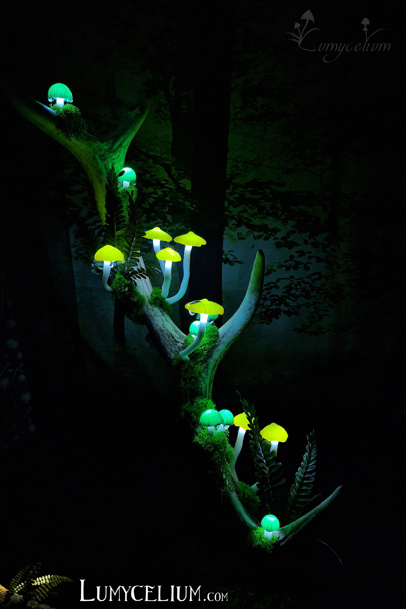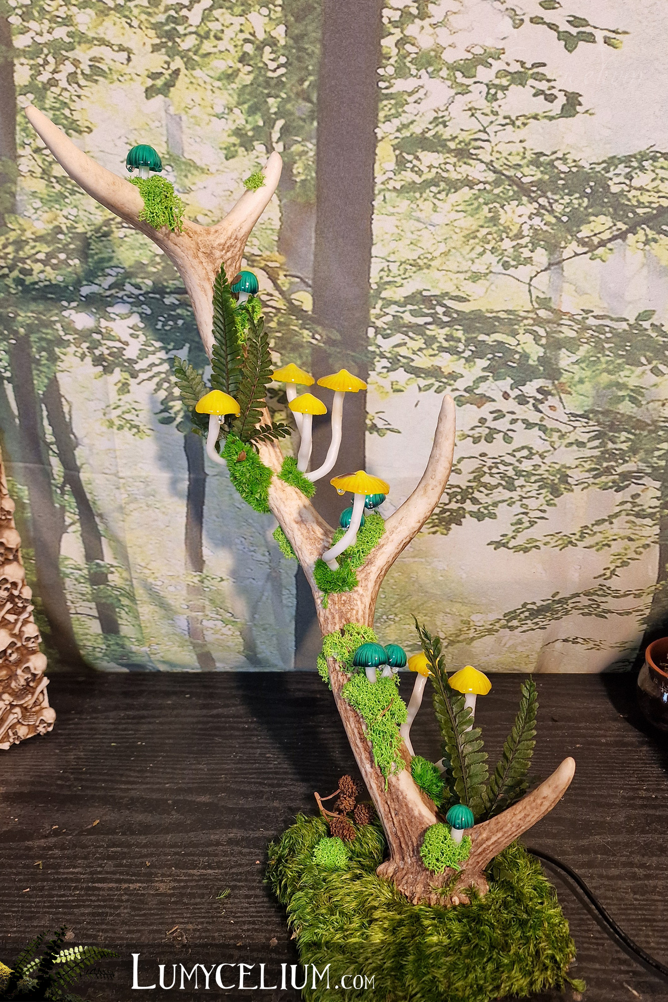 Pièce sur bois de cerf élancée verticale agrémentée de champignons jaune et vert